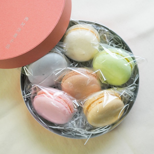 しっとり焼き上げたメレンゲ生地と たっぷり挟んだ口溶けのよいクリーム リピーターも多い人気のマカロン全6種を オリジナルBOXに詰め合わせました ギフトにも大変好評いただいております ----------------------- ◎内容 ・いちご ・ピスタチオ ・黒胡麻 ・バニラ ・栗 ・塩キャラメルチョコ 各1個 ◎サイズ 〈お箱〉直径16cm×高さ7cm ◎配送方法 冷凍発送 8,000円以上お買い上げで送料無料 〈発送可能日〉月・木・金・土・日 ◎アレルギー情報 卵、乳、アーモンド ◎消費期限と保存方法 冷凍30日 解凍後3日間 ※温度や湿気の影響で賞味期限が変わることがございますので早めにお召し上がりいただくことをお勧めいたします